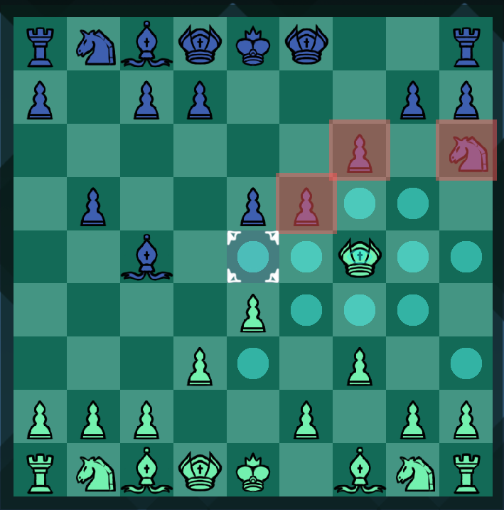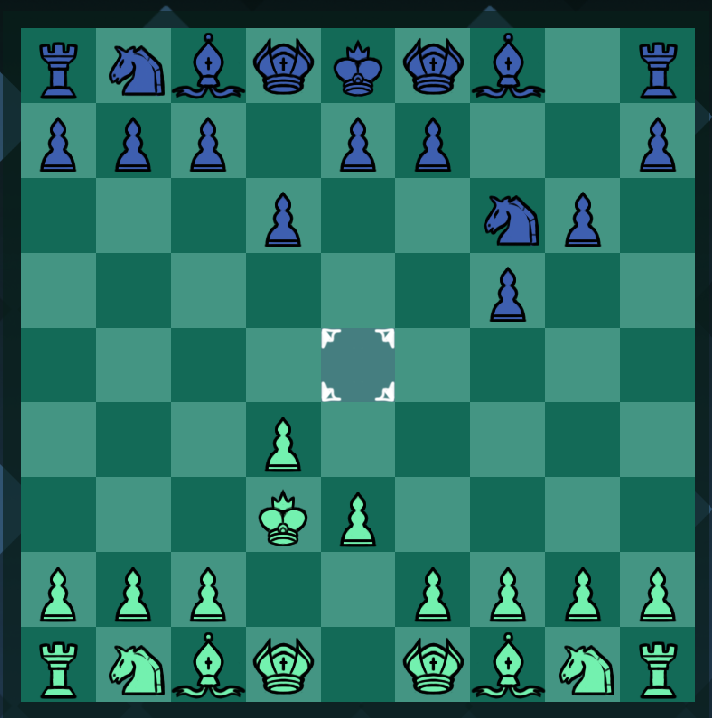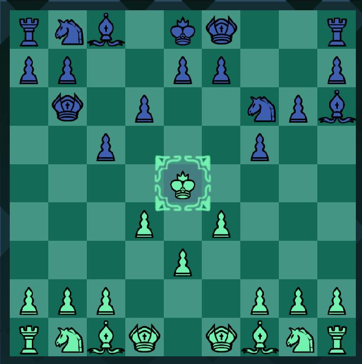 A prototype for a new chess-like game where victory can be achieved by moving your king to the central square. The board features an extra column and two queens with limited movement. If you bring your king to the central square and keep it there for three consecutive turns, you win the game. The game used to include an online mode with integrated chat, but it is no longer supported. Please use the guest mode if you wish to play. Keep in mind this is a prototype, so gameplay bugs may occur.